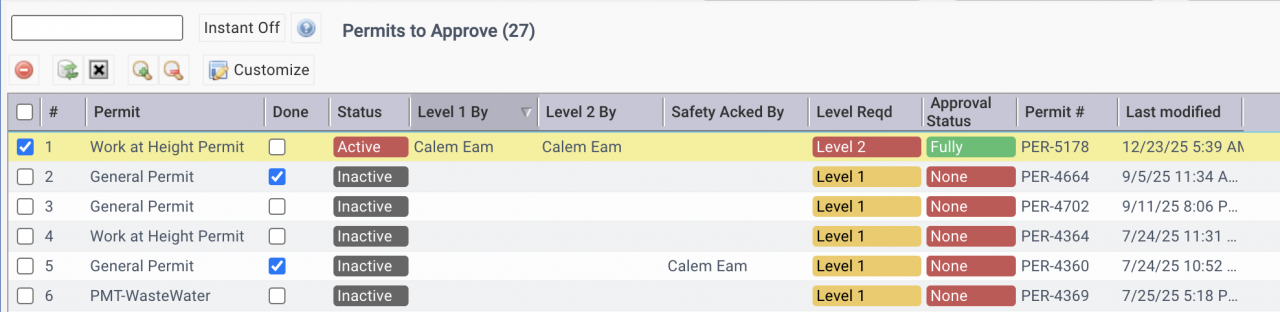 A new menu to show permits waiting for approval is available from Open WO list view. The new list of permits to approve allows safety personnel to review and approve permits efficiently.