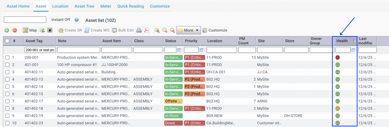 Asset health is available in the coming release of Calem R2025h (December 2025). It is calculated daily for each asset as a dropdown of three levels: Good (low risk to fail), Moderate (moderate risk to fail), and Critical (high risk to fail). It is presented in asset list and record view (screenshots below) as green, yellow and red smiling faces.