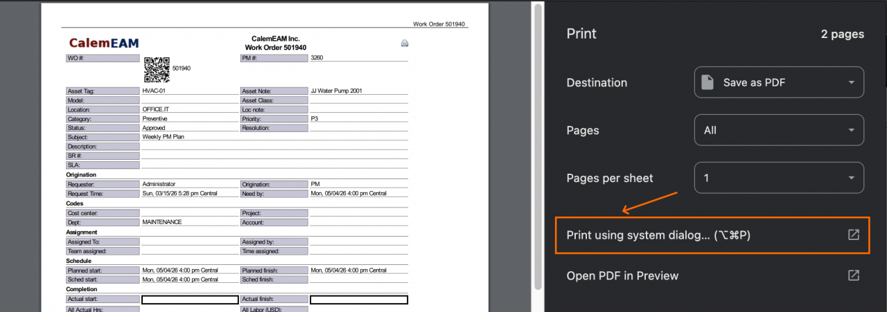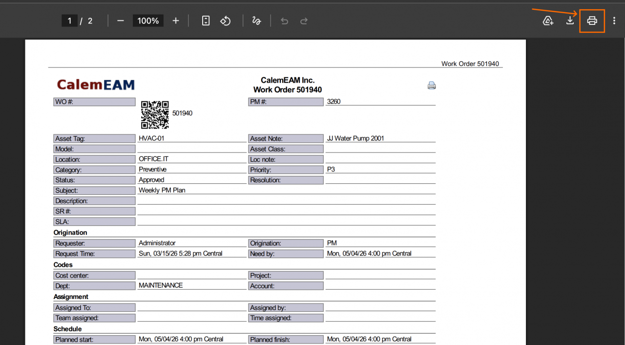 A work order print can be launched from a PDF or print button in work order forms (e.g. screenshot below). A print preview screen is displayed when printing from a Chrome browser (next screenshot).