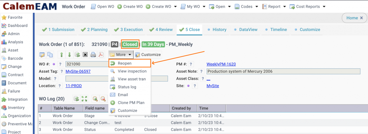 Administrators can also define life-cycle status transitional graph based on business requirements. For instance, WOs that are canceled can only be transitioned to New to be reinstated, no other transitions are allowed. See Calem Enterprise Admin Guide for details.