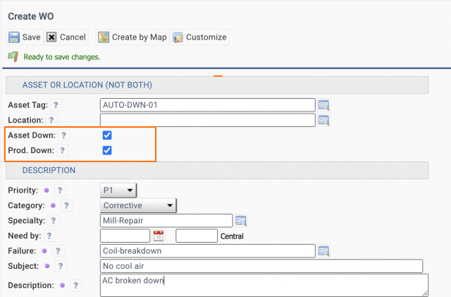 Set "Asset Down" flag checked when creating a work order for an asset down event.