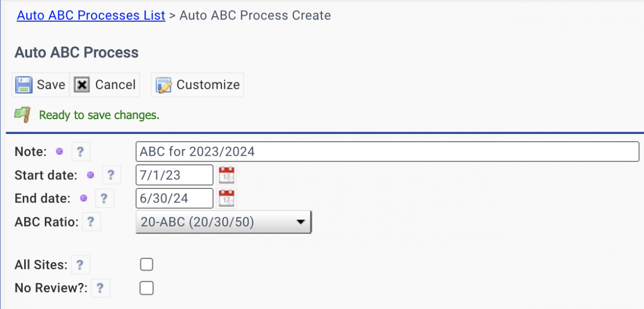 - Select an ABC ratio. ABC ratios out of the box and custom ratios may be used.
