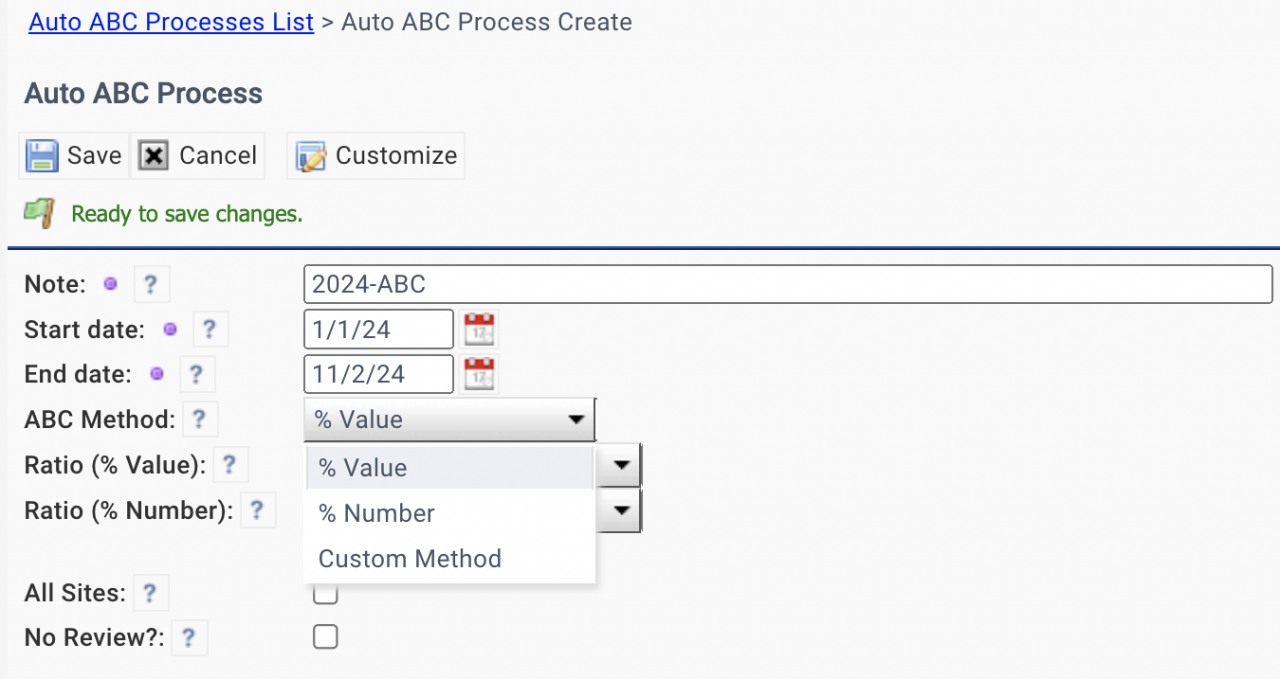 - A custom ratio needs to include the ratios for A and B items. For instance, the A items are the top 15% of items by value. B items are the next top 25% of items by value.