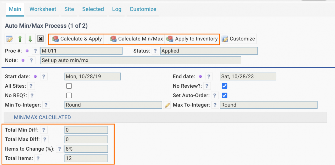 - "Calculate & Apply" to execute the process from calculating new min/max levels to applying changes to inventory.