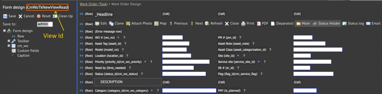 - The View ID is shown at the top left section of the left panel of the form design screen.