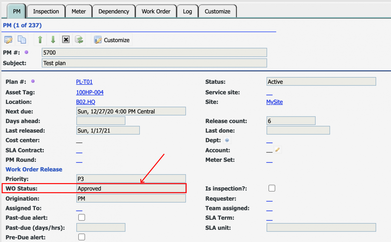 - Set "WO Status" to "Approved" which makes the PM work order generated from the PM to be of the "Approved" status. Approved work orders will have their parts reserved automatically. It is critical for requisition generation.