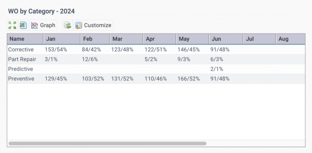 This KPI provides the composition of maintenance work in terms of work order categories including preventive, predictive and corrective. It allows an organization to set up a goal of maintenance work mix and measure the outcome. For instance, a composition goal may be over 2/3 work orders for preventive and predictive, and less than 1/3 for corrective.