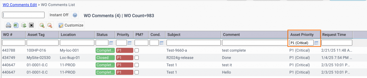 Next, launch "All WO" form at "Work Order | Open | All WO", select a work order and click "Customize" (with print icon):